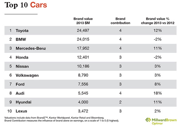 Это очень впечатляющий результат: BrandZ™ публикует свой Тор 100 начиная с 2006 года, и из восьми раз марка Toyota занимала первое место целых шесть раз. Несмотря на последствия глобального кризиса и различные объёмы продаж в разных регионах, согласно рейтингу BrandZ™, ведущие мировые автомарки смогли удержать свои позиции в Топ 100, а некоторые их даже улучшили. Так, например, стоимость Toyota только за 2012 год выросла на рекордные 22,6%. В прошлом году в мире было реализовано 9,75 млн. автомобилей японской марки.